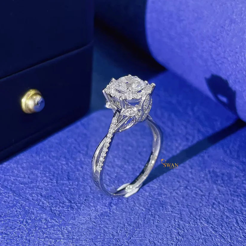 Round Cut Solitaire Halo Moissanite Engagement Ring in 925 Sterling Silver with Pavé Band Elegant Bridal Jewelry Gift for Her swandiamond